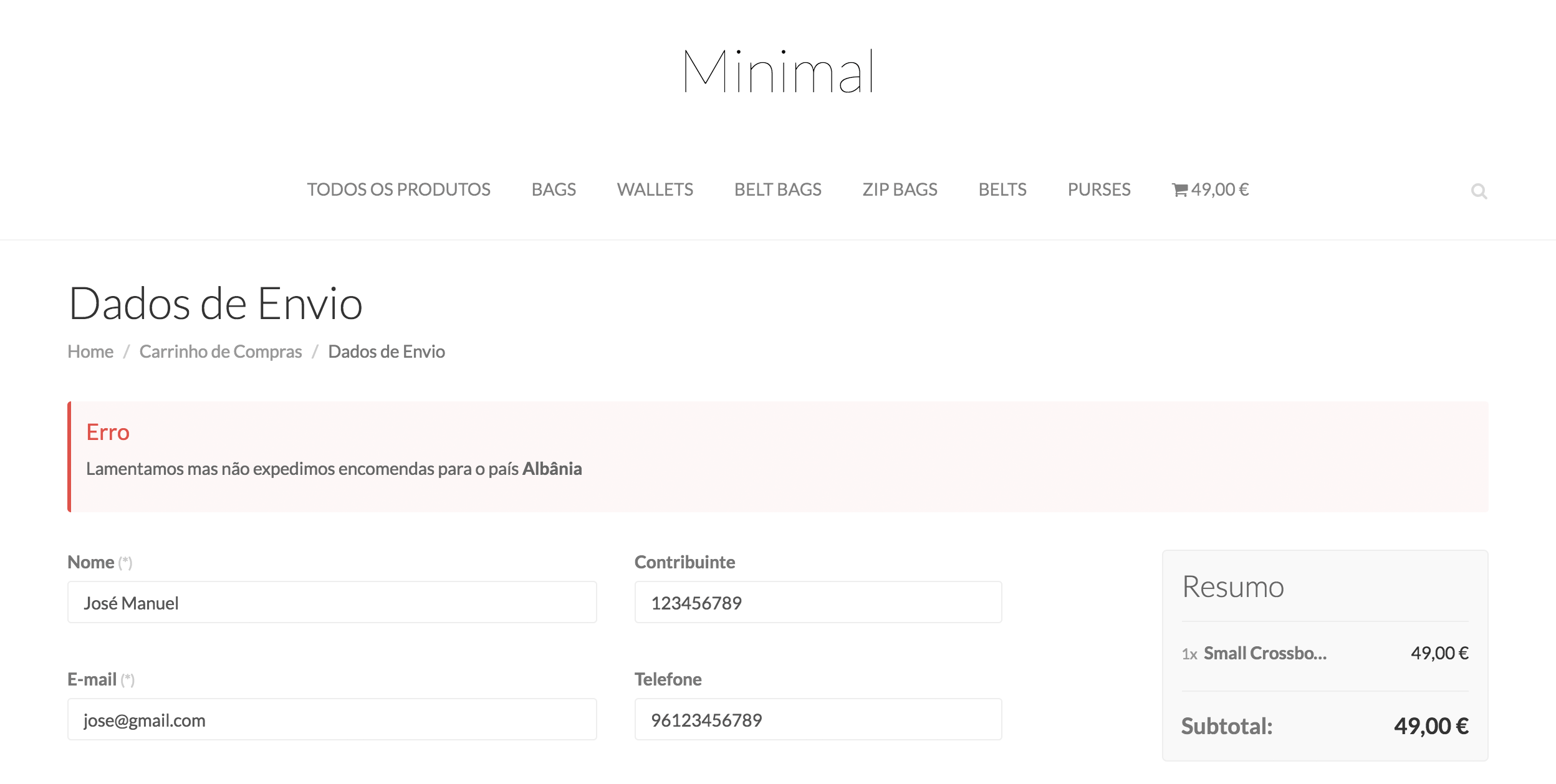 Quando configura os métodos de envio, os seus clientes podem selecionar qualquer país para o envio da encomenda. Se não tiver configurado nenhum método de envio que inclua o país escolhido, por exemplo Albânia, ao prosseguir com a encomenda o cliente recebe a seguinte informação: Lamentamos mas não expedimos encomendas para o país Albânia.