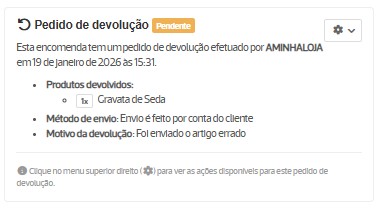 Se o cliente iniciar o pedido, pode selecionar suportar os custos da devolução da encomenda ou solicitar a guia de devolução, caso tenha esta opção ativa no menu Configurações / Encomendas. Se pedir a guia de devolução, posteriormente, na ficha da respetiva encomenda na roda dentada (⚙️) tem a opção de Criar guia de devolução. Ao criar/associar a guia, o cliente pode obter a mesma na área de cliente na loja ou através do email com a atualização do estado de encomenda.