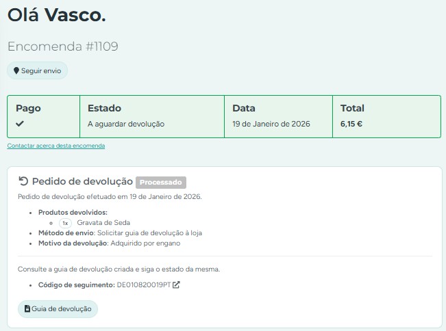 O pedido de devolução fica pendente na área de cliente até que o comerciante crie uma guia de devolução na respetiva encomenda no menu Encomendas. Após a criação da guia, o pedido é processado e a mesma fica visível na área de cliente na loja e o cliente também recebe um email com a atualização do estado da encomenda.