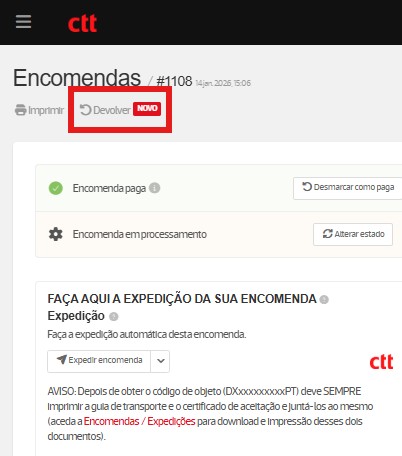 • Pedido processado: pedido de devolução em que a guia já foi gerada e em que o cliente irá entregar a encomenda num Ponto CTT para devolver os produtos solicitados.