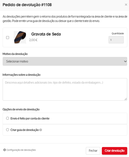 Se o pedido for iniciado pelo comerciante, pode optar por gerar/associar a guia de devolução para que o cliente a possa utilizar para devolver a encomenda ou ser o cliente a suportar os custos da devolução. Se gerar a guia de expedição, o cliente recebe um email com a guia e a respetiva atualização do estado de encomenda ou pode obter a guia na sua área de cliente na loja.