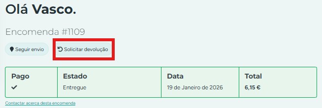 Para solicitar o pedido de devolução, o cliente deve aceder à sua área de cliente na loja e, a partir do separador Encomendas, clicar em Solicitar devolução, nos detalhes da que pretende.