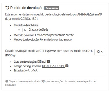A guia de devolução, a referência à mesma e as respetivas informações surgem na ficha de encomenda (menu Encomendas). Podes aceder à guia, verificar o tracking do objeto e o respetivo estado ou remover a devolução.