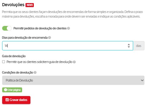 Dias para devolução de encomenda: defina o prazo máximo de dias em que o cliente pode solicitar a devolução da encomenda. O prazo é contabilizado a partir do momento em que as encomendas estão no estado Entregue;