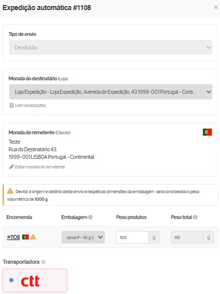 Quando o cliente entrega a encomenda à transportadora, o processo de envio é o mesmo de uma expedição: o tracking é gerado automaticamente e pode ser utilizado para acompanhar o envio, e o estado da mesma é atualizado também de forma automática de Entregue ou A aguardar devolução para Devolvida.